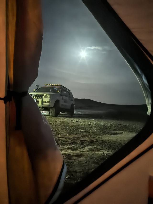 过了垭口,就比较顺利,除了颠簸,和一部车爆胎外,我们在日落时刻到了第一个露营点。夜晚,伙伴们放起了烟花,当漆黑得漫无边际的夜晚被璀璨的烟花划破,当烟花的绚烂与皎洁的月亮重叠,当极致的安静与阵阵爆燃声交替,我的心,脱离了一天的疾驰,在此刻,安定了下来,定在了戈壁荒漠里,定在沉静月光中。正融入此刻此心的时候,于夫教授悠扬的萨克斯缓缓飘来,我搬着小板凳,远远的坐在月光下,荒漠、圆月、烟花、音乐,我的当下,太过奢侈。奢侈到不敢承受,【这是此行我的第一次极致时刻】。