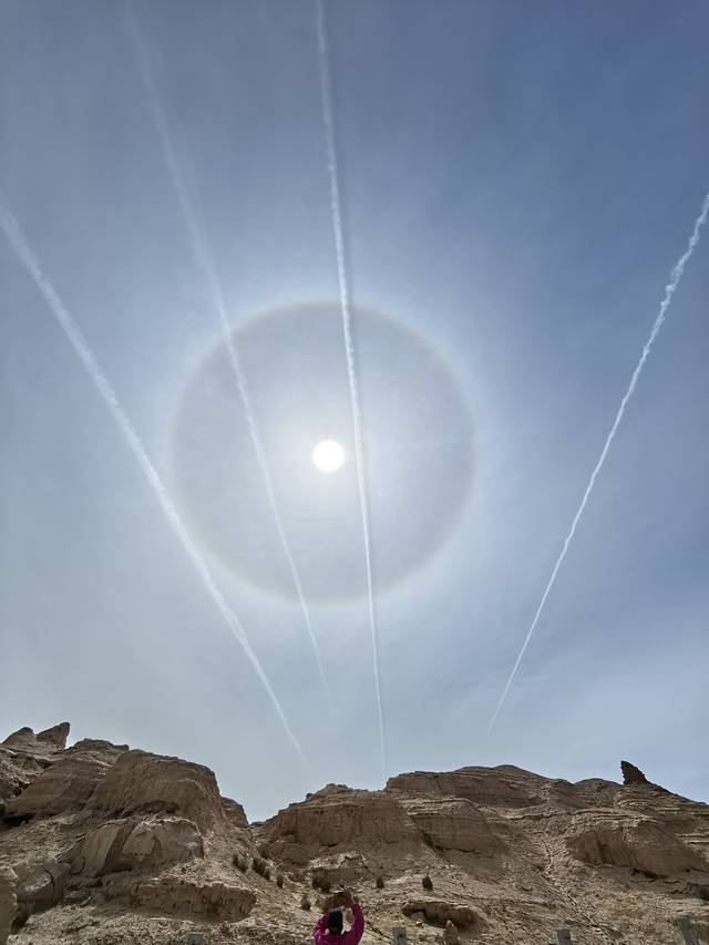 从敦煌出发丝绸古道,最先见到的是国家重点文物保护单位汉长城烽燧土木墩。有幸爬上去,“长城”下伙伴们拍到了我背后天空出现的光晕,预示着此行必定炫彩难忘。