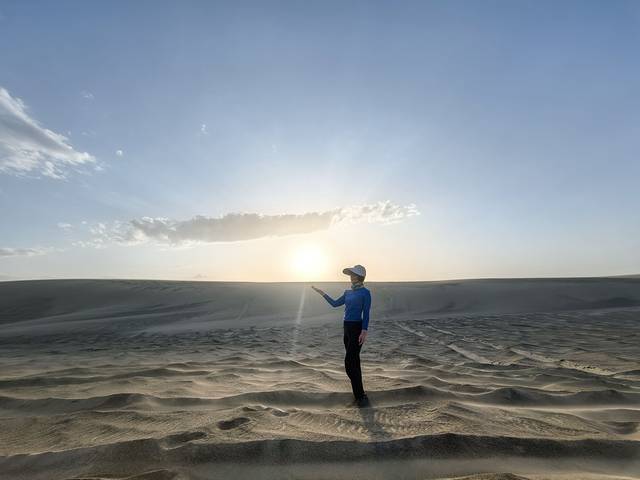 即便这样,我还是坐不住了,不能再等在车里,我要我的日落。于是,我冲下车,在大印哥手疾眼快地按下快门中,我终于和日落亲密合影了。风沙吹得我不能呼吸,但这是【愿望实现的幸福时刻】。