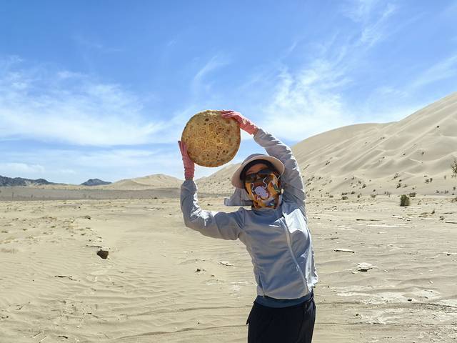 快出沙漠时,一处救援成功,一会又陷一处,伙伴们徒步先行,到沙丘尽头等车队,“师徒四人”每人拿着一个馕合影,徒弟说,“这是师父画的大饼”,笑作一团,大家还真是善于苦中作乐。我和几个伙伴踢起了毽子,累了靠在车门打了一会坐,在出定的一瞬间,我听到旁边于夫教授说,车出来了,看来冥冥中真是有定数啊。胜利终将属于我们。说来难得,每天差不多一半的时间都在救援,而临近出口、胜利在望时却最为绝望,也许黎明前的黑暗,最后一刻前的坚守,就是大自然考验人类的规律吧,那些愈发艰难的时候再忍忍,因为胜利就在不远的地方了。