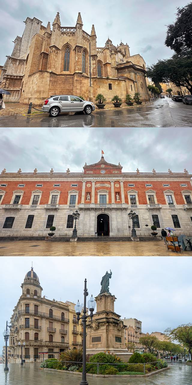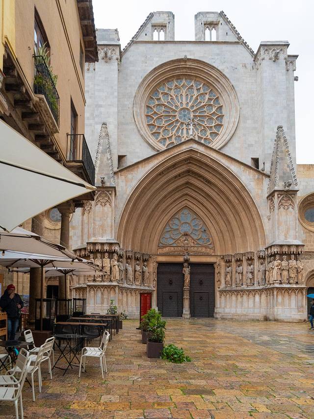 下图是修建于11世纪、在本世纪初得到修复的塔拉戈纳主教座堂,融合了罗马式与哥特式风格。教堂正门是罗马式雕刻的典范,门楣上浮雕着《最后的审判》,人物表情和动作生动有力,都值得细细端详。而侧面的玫瑰窗和尖塔则带有鲜明的哥特式轻盈感,据说晴天当阳光透过彩色玻璃投射进教堂时,仿佛将天堂的光辉引入人间。