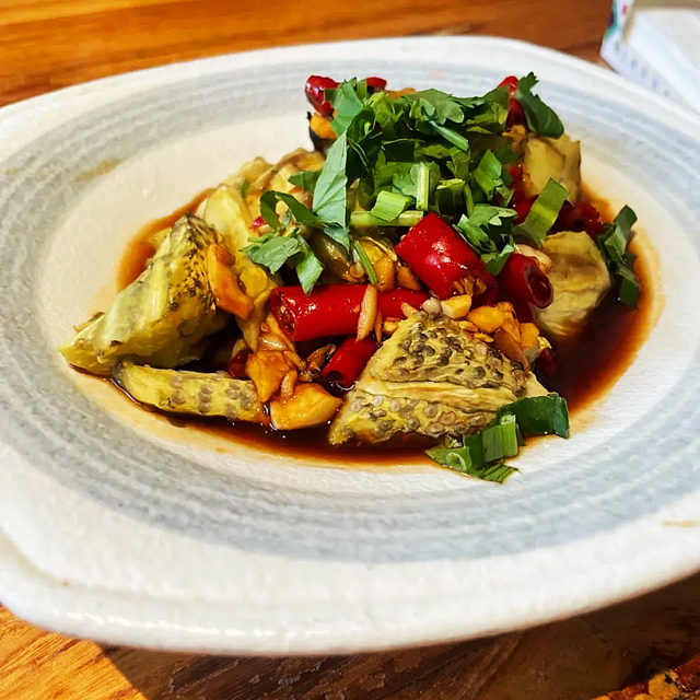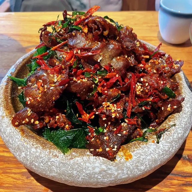 【香柠叶炸牛干巴]这个有点辣、有点咸、有点干,我是很喜欢的,但我朋友不太爱她觉得嚼着费劲,太干巴了 (真就是牛干巴)我看是时令新菜所以点来尝尝,其实个人觉得还不错~