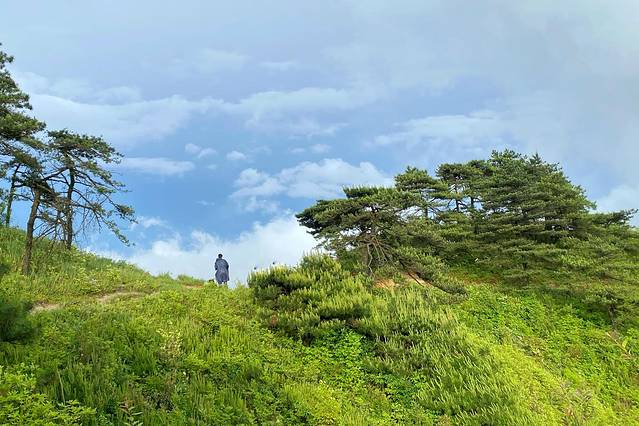 爬了大概三四个小时之后,乌云退去,天气渐渐晴朗,而我也冲出了树林,开始趋于平缓的在山间穿梭。