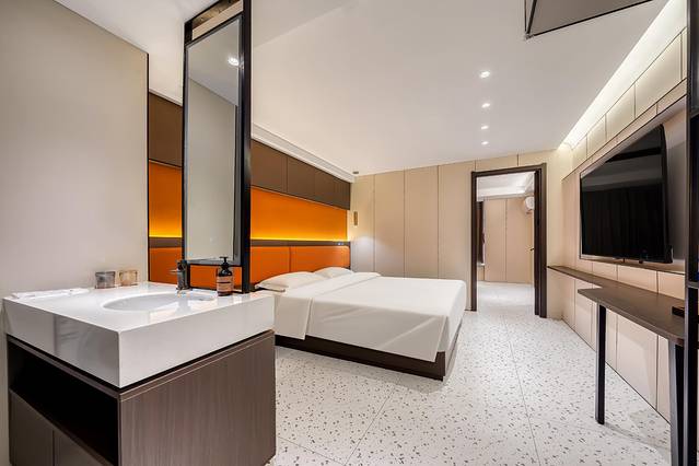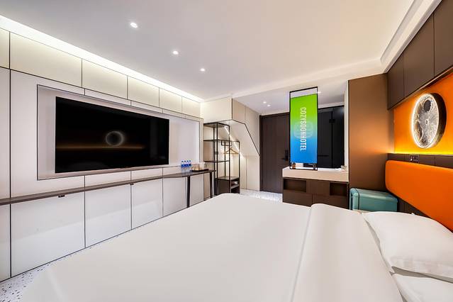 房间配备齐全设施。超大平板电视,汇聚海量影视资源,闲暇时可尽情追剧观影。高速无线网络全覆盖,在线办公、畅玩游戏都流畅无阻。迷你冰箱内储备丰富饮品,满足你的味蕾。独立卫浴间采用干湿分离设计,提供高品质洗浴用品,让你在疲惫一天后能享受舒适沐浴时光。