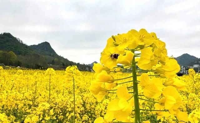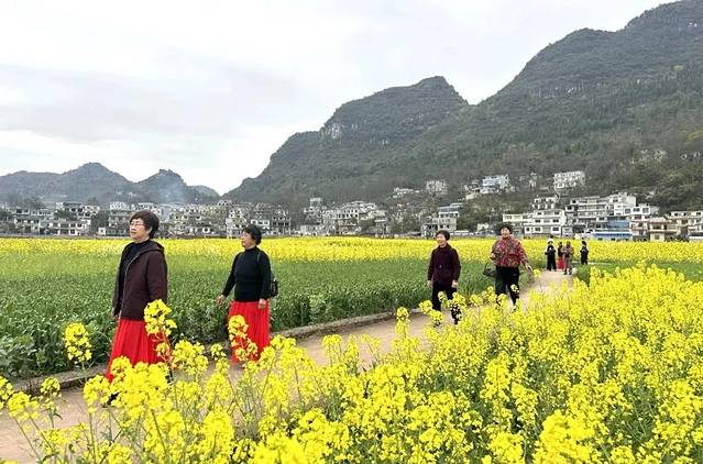 走进永丰街道岩鱼村,油菜花肆意绽放,金黄的花海与错落有致的布依古寨、碧绿的山水相互映衬,勾勒出一幅如诗如画的田园美景,吸引了游客前来踏青赏花,享受着春日美好时光。