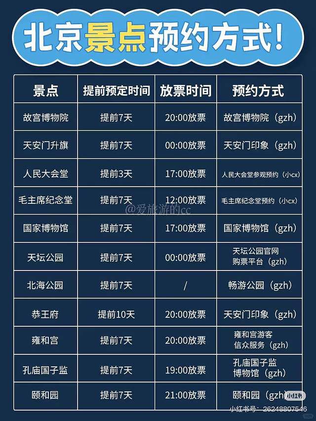 接下来就是各种看攻略,北京的攻略是最难的,关注了好多公众号。因为所有要去的地方都需要预约,包括天安门广场,各种公园,而且还要看放票的时间,我们行程怎么安排方便,哪些可以一起玩,公交出行如何到。这个住宿到底选哪里。当然还有我的预算。最近几年出门功课最多的一次。下图是看的别人的预约攻略。