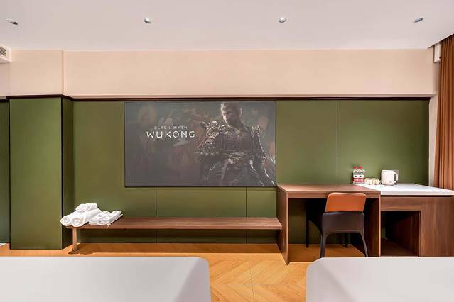 房间的设施也特别全,高速稳定的 WiFi、超大尺寸的投影等等,一应俱全。卫生间干净整洁,热水出得又快又稳定🛀