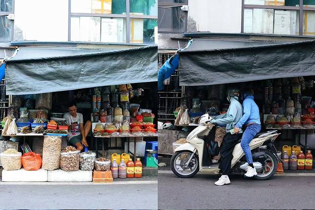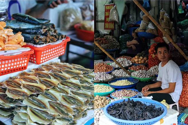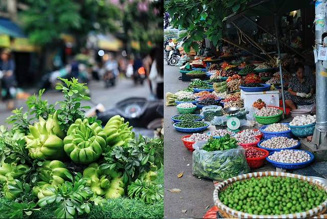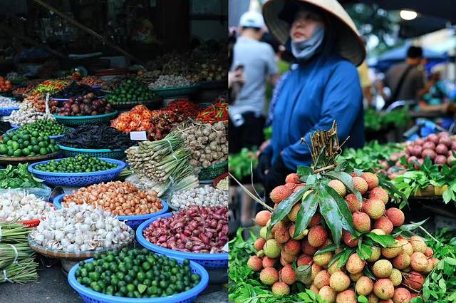 与市集夜市相比,同春市场更能感受河内市井生活,这是一个有着百年历史的老市场,兼具批发和零食的大市场,同时也见证了河内从传统市集到现代商业的变迁,被称为“河内的生活博物馆”。这里就像一个天然视觉的调色盘,佛手柑、薄荷叶、香菜、柠檬叶、香茅、小青桔、青柠檬形成不同色调的绿,蒜头、凤梨、白洋葱、虾米、虾干、干贝勾勒出不同的深浅的黄色,荔枝、李子、辣椒搭出红红火火的生活。