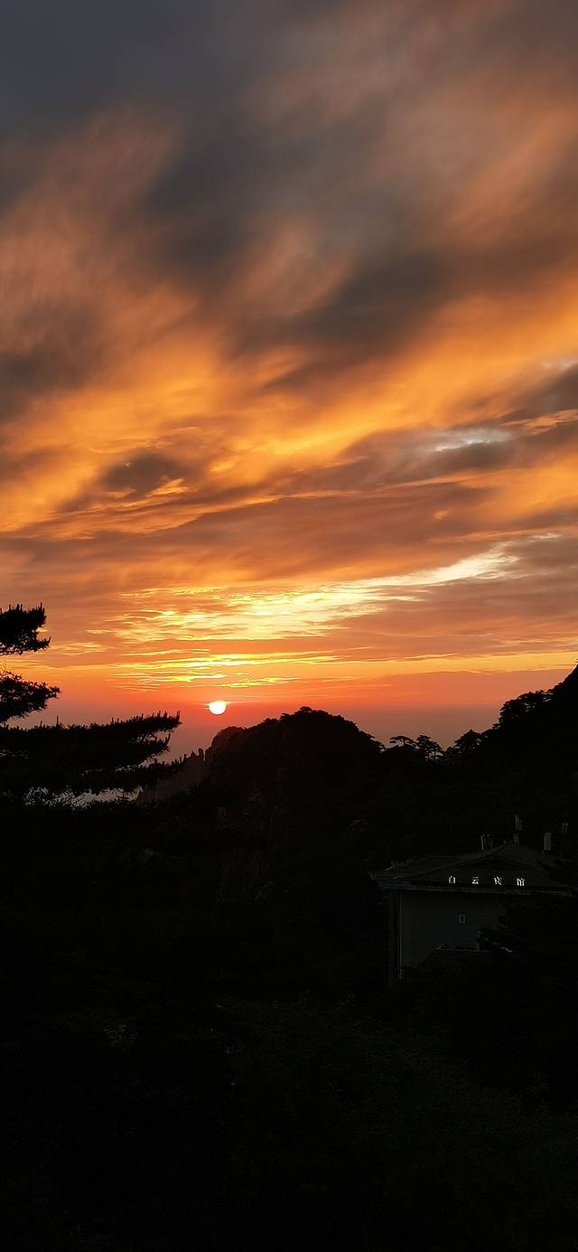第二天凌晨三点半起床,洗漱完,喝点茶休息一下,这天早上17度左右,我穿了圆领内衣+衬衫+外套夹克衫,只穿一条秋天长裤,没有穿宾馆提供的羽绒服,到4点出发去光明顶看日出,到达光明顶时己经有五、六十人了,我穿这点衣服不感觉到冷,但风很大,吹了头和脸受不了,赶紧把夹克提起来罩着头才感觉舒服。我选了一个前面没有人的位置站那里等待观看日出,4:30分左右已经能够看见太阳的朝霞了,但太阳还没有出来,到了4:55分的时候除了远处有几道金色光带外,已经是满天红色霞光了,随着金色的光带越来越多,越来越亮,满天的红霞也越来越多,越来越亮,在5:10时太阳才露出一个小点,随着时间的推移,太阳也由一个点到小小半圆、再小半圆、半圆、大半圆、一点点地变大,最后整个圆都出来了,这时是一颗非常明亮而略带一点点金色的太阳,太阳周边红彤彤的,在太阳朝向我们的前面,几道横向的云层,被太阳的光芒照耀形成如同金色的彩带一样,非常的美,随后太阳也越来越亮,也变得非常的耀眼,这时已看不清太阳圆的明显边界了,围绕太阳周围一片圈是金色的光芒,很好看,5:15分后基本稳定,太阳继续向上升起,进入云里,再出云端,越来越耀眼,太阳周边尽是金色彩带和红色的朝霞,给人带来了新的一天温暖和希望。人们渐渐地离开了,有的开始新的一天景点旅游,有的回宾馆用餐了。这天,白云宾馆6:30早餐,我先回到宾馆休息一下,再去餐厅用餐,用好早餐后看时间还早,7点还没有到,就回到房间继续休息,略眯着一些,起来把东西清点一下,手机和充电宝都充足,水烧好备好,卫生间上好,东西全部整理好后到大堂退房,出了白云宾馆己早上8点15分了,开始今天的旅程了。
