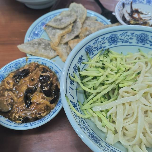 继续从东门出来,就近找了个地方吃饭,点了炸酱面、打卤面、卤煮、炸灌肠、爆肚、麻豆腐,除了麻豆腐是用羊油炒的接受不大了,其他的都可以。