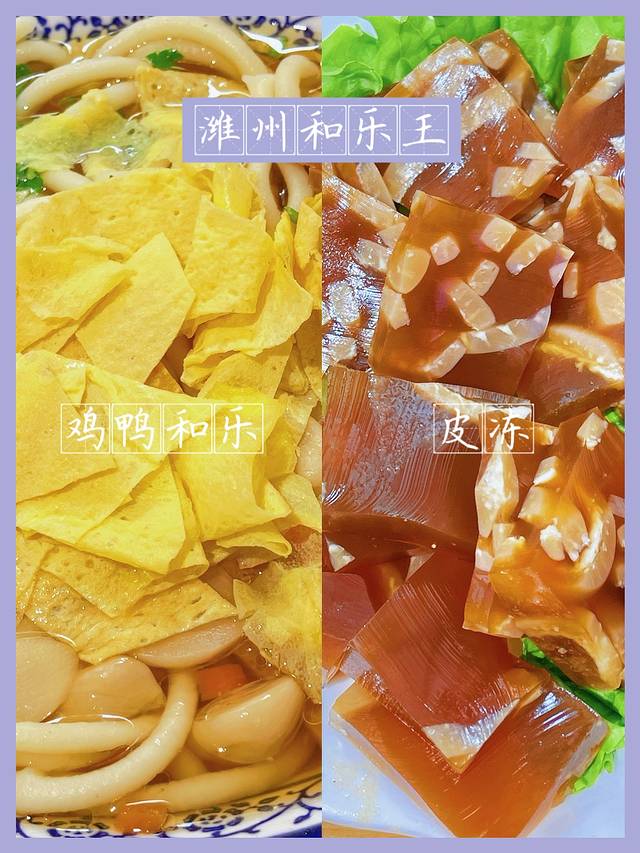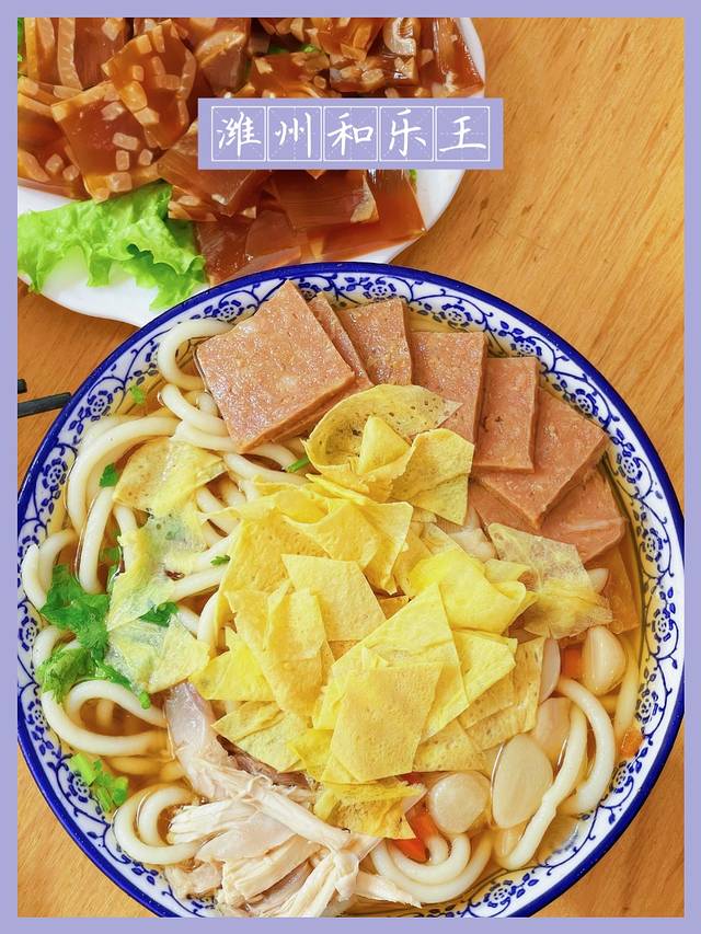 ·鸡鸭和乐:有特色的潍坊小吃,和乐条里的配菜丰富,鸡鸭肉鸡蛋皮还有糖蒜在里面,面汤特别好喝可以续,面量惊人,好大一碗,筒子们,桌上的香椿和韭菜加点在面里,惊喜!