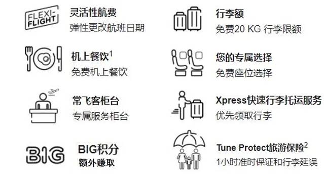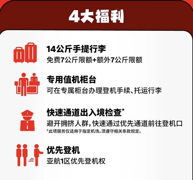 购买快速通行证的话,即可享受4大出行权益,包含14公斤手提行李(免费7公斤限额+额外7公斤限额),还有专用值机柜台、优先登机、指定机场快速通道出入境检查等服务,特别适合需要在转机、带娃家庭、商务人士。
