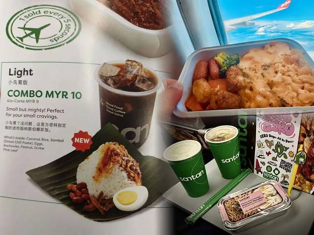 亚航的餐食真的被低估了!自有品牌SANTAN提供超多东南亚特色美食,椰浆饭配炸鸡、泰式冬阴功面等等,每一款口味都不踩雷。建议提前24小时在官网预订,比机上买便宜 20%,还能保证有你想吃的口味。