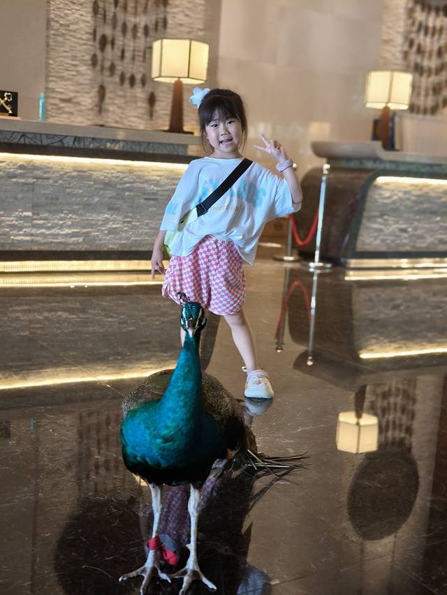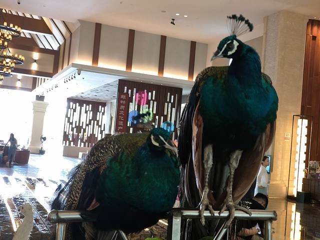 早上一大早,我们收拾好行李,吃完早餐,准备换一家亲子酒店,感受西双版纳慢时光,我们选择了洲际旗下皇冠假日酒店,打车到达酒店门口,大堂就有3只孔雀迎接旅客,还有几只悠闲散步的孔雀,充满了热带风情,第一次跟孔雀这么近距离的接触,孩子们都很开心。