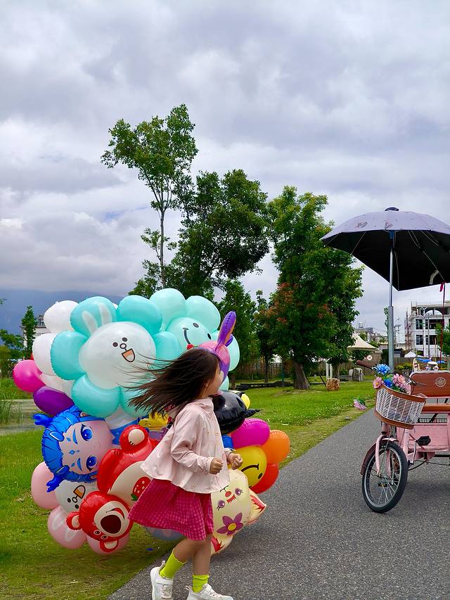 往回走的路上,一个哥哥送给小妍好多气球,昨天还以为飞走一个气球伤心,今天就得到这么多,很开心,一路上带着这些气球,吸引来所有人的目光,她说我们把这些气球卖了吧,我们俩就边走边喊卖气球,最后一个气球也没卖出去,留在了民宿老板家,拉着行李就要赶路啦