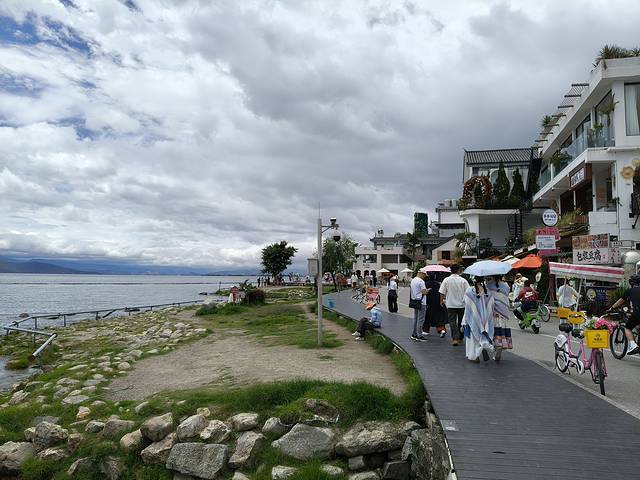 这几天天气不是很好,没有太阳,云层比较厚,我们就住在S湾旁边的民宿,这里之前就是一个个村庄,被改造成了民宿海景房,沿着洱海边一路走过去全部都是民宿和商铺,可以租个自行车或者电动车悠闲的漫步在廊道上,这里有一个比较坑的地方,洱海边都有围栏,把民宿都挡在外面,也就是说如果你在民宿租的电动车是没办法骑到洱海边的,海边有自己的运营的电动车,海边运营的电动车又没办法骑出去,也就是说你需要规划好自己的路线,以免重复租车,我觉得没必要租外面的电动车,可以在廊道内租一个电动车,绕着洱海转,景区都在海边,大理古城远一点,你可以骑车骑到才村码头,有小黄车会把你从才村带到大理古城,费用15元。路程大约十来分钟。