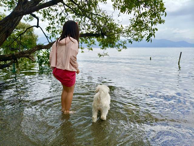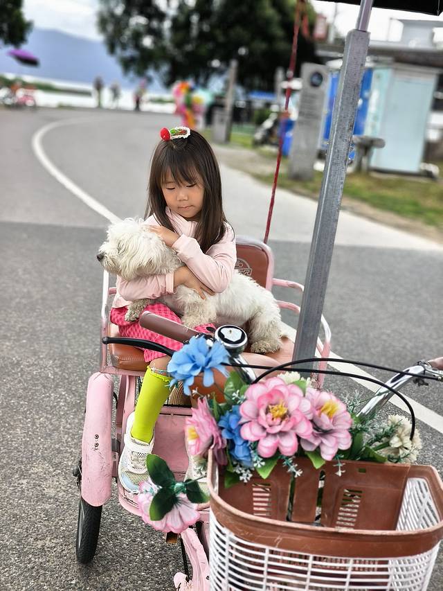 今天是旅程的最后一天,依然选择洱海,昨天往北骑,今天就往南骑,租个这种三轮车,带个顶棚,还可以防晒,就是车子不是很好骑,比较累人,民宿老板家的狗狗跟我们相处了一天,第二天就跟着我们一起出去玩了,小妍一路上抱着它,偶尔下车一起疯跑,一起踩水,太欢乐了