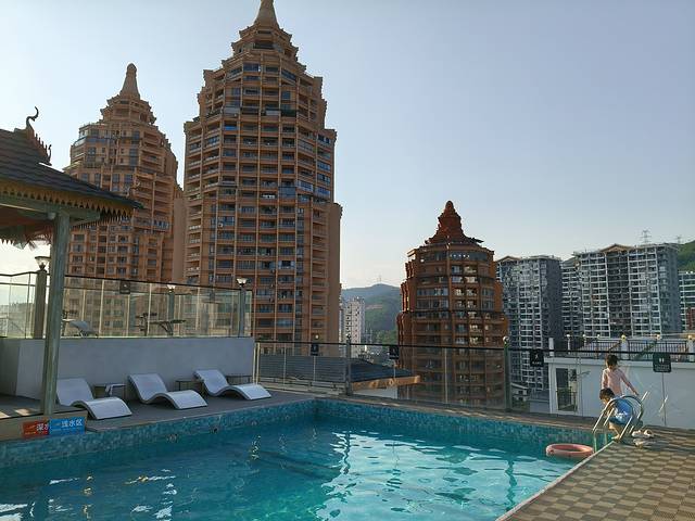 打车前往预定好的酒店,我们住在告庄杋高酒店,网上说告庄的酒店环境都一般,而且很吵,本来没报什么希望,因为一天只有100+的房费,还要什么自行车,但到了酒店之后发现比我预期的要好很多,一整栋楼都是一家酒店,楼顶有泳池,而且人很少,两个孩子可以肆意玩耍,虽然身处闹市,却并不吵闹,房间很大,还带早餐,虽然菜品不多,但是我已经很满足了,这是我住过最具性价比的酒店,服务也很好,我们提前在网上买的雨鞋和涉水服,服务员帮我取快递送到房间,而且位置也很好,离星光夜市很近,步行就可以到,门口有很多电动车,租一天是30元。共享电动车有区域限制,我们本来想骑共享电动车去江北 夜市,但是半路说超出区域,不让骑了,我们去的时候有个桥正在修,星光夜市到江北夜市本来很近的路程,却要绕很远。遗憾大金塔正在维修,围挡着没有看到金碧辉煌的壮丽景象。但星光夜市晚上灯光还是很出片的,有很多人在旅拍。
