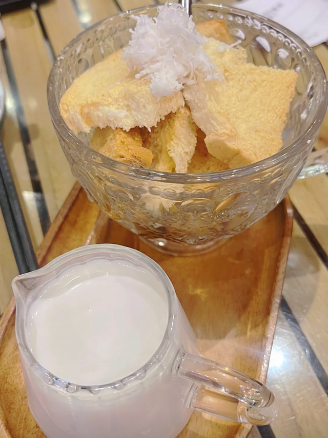 椰香泡鲁达烤面包片搭配椰奶,算主食和半个甜品