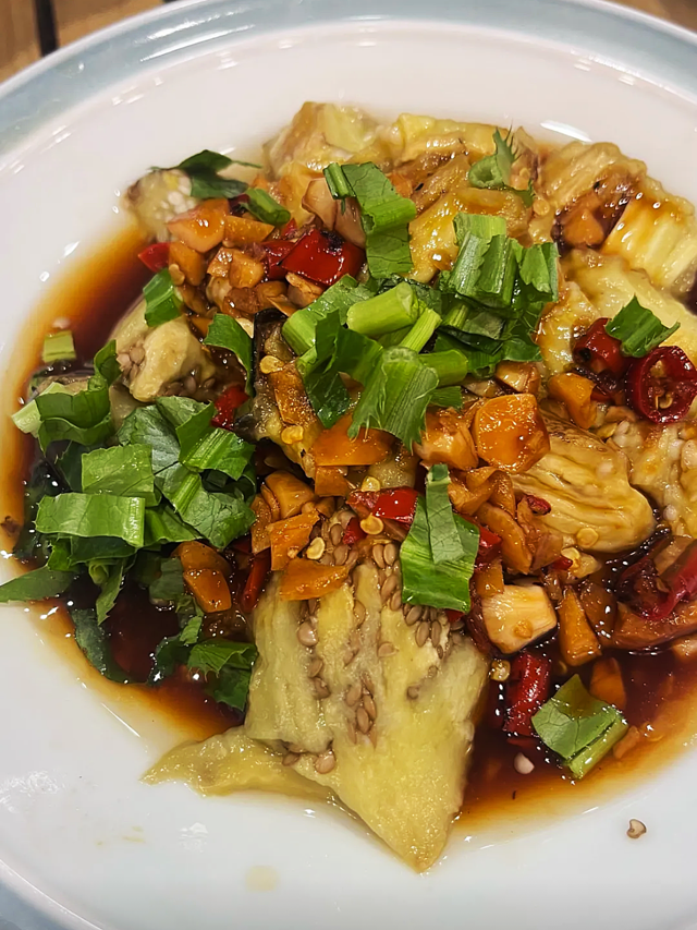 烤茄子 这道凉拌菜不错,茄子烤得软软的,凉拌汁很下饭