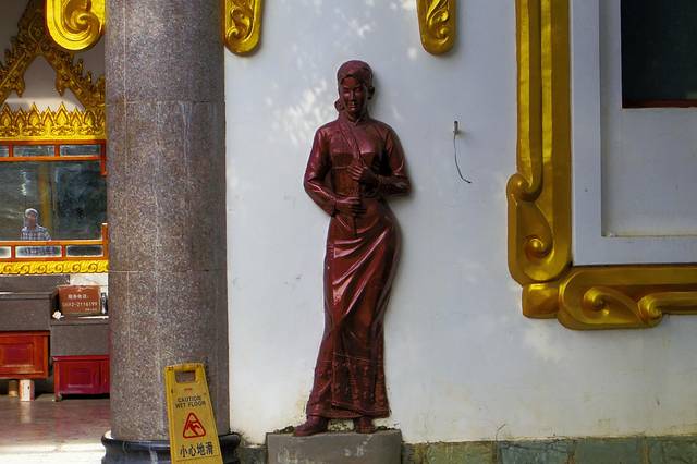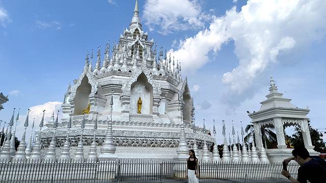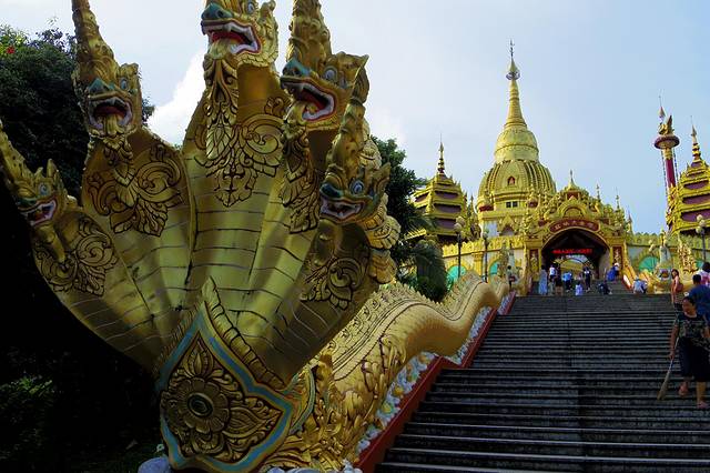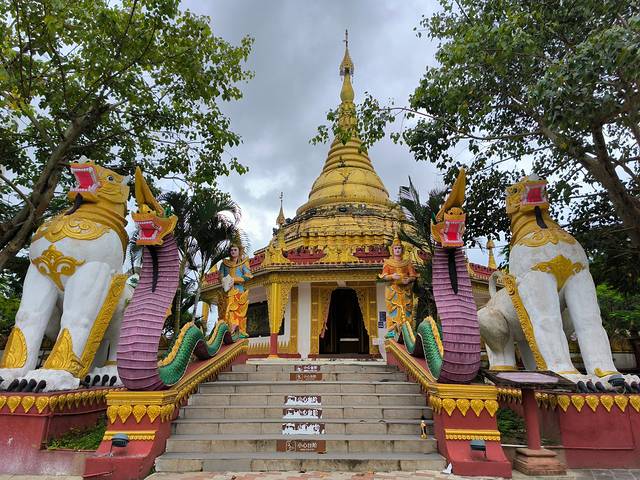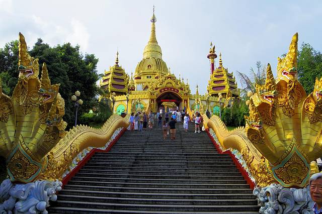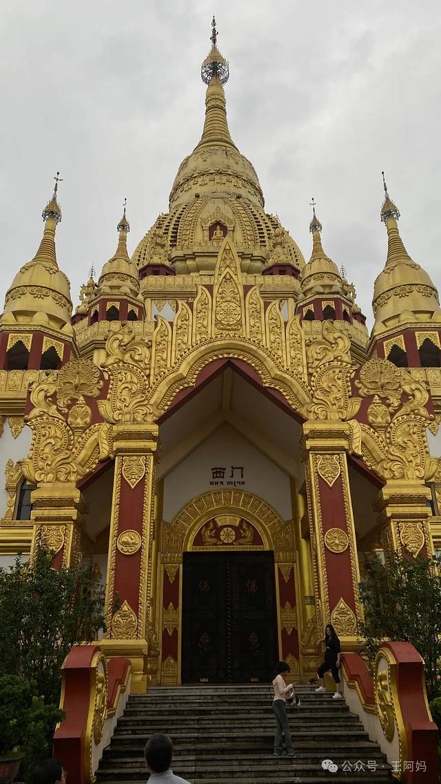 勐焕大金塔矗立在雷牙让山之巅,远远望去,金光熠熠,宛如一颗璀璨的明珠镶嵌在绿色的山峦间。踏上通往金塔的台阶,每一步都仿佛带着虔诚与期待。金塔周身装饰着精美的雕刻与繁复的花纹,在阳光的照耀下散发着神圣而庄严的气息。塔内香烟袅袅,佛像庄严肃穆,信徒们双手合十,闭目祈祷,那一刻,心灵也随之沉静下来,仿佛能感受到信仰的力量在流淌。绕着金塔缓缓踱步,俯瞰整个芒市城,鳞次栉比的傣家竹楼与现代化建筑相互映衬,蜿蜒的河流如同丝带般穿过城区,景色美不胜收。