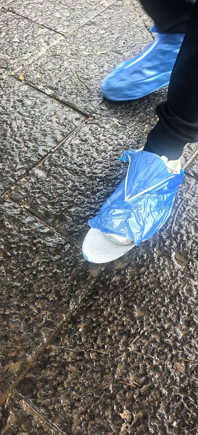 走了没几步,儿子脚上20元买的鞋套,已经走完了它短暂且平凡的一生!