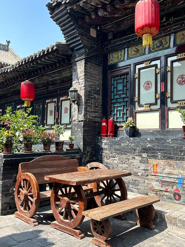 一进门就是一个大院落,保留原有的宅院气息,加上绿植的点缀和院内摆放的椅凳一下就有了度假的感觉。真实拥有百年历史的三进式客栈,装修也是 平遥 古城风格,完全符合我对古代客栈的想象,可以体验古代主人房的窑洞房,还有绣楼的龙凤床