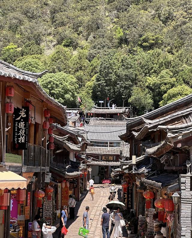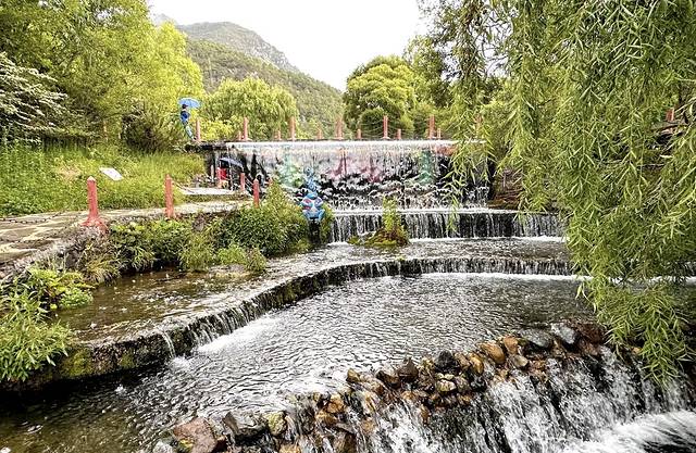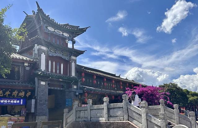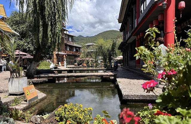 从丽江古城打车到束河古镇东南门,大概二十分钟的时间。一到就发现大门十分气派,进门后还可以扫码租用如图二里的电瓶车,四个人正好坐一车。这车的行驶速度非常慢,我们大概用了一个半小时才逛完一圈回到原点。我们从“四方听音”开始(这就是一个广场,白天没啥可看的,晚上据说有篝火晚会),依次去了“飞花触水”,“青龙桥”,“九鼎龙潭”。“飞花触水”这一块儿挺漂亮的,也有挺多餐馆可以吃饭。总体而言,束河的物价比丽江古城要便宜一些。