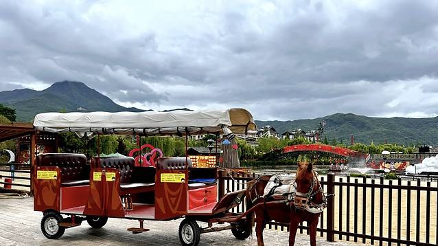 束河古镇街道上有好多马车,这为街道增添了一些“味道”。这里的游人也相对比较少,开电瓶车不会有任何困难。