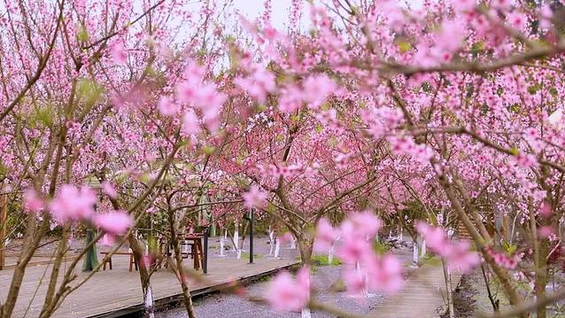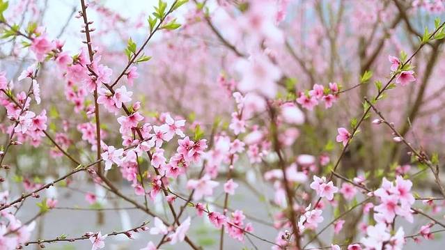 桃花、柳树、小桥、绿水相互映衬,成为一幅绝美的画面……暖暖的春阳下,朵朵桃花恣意绽放。