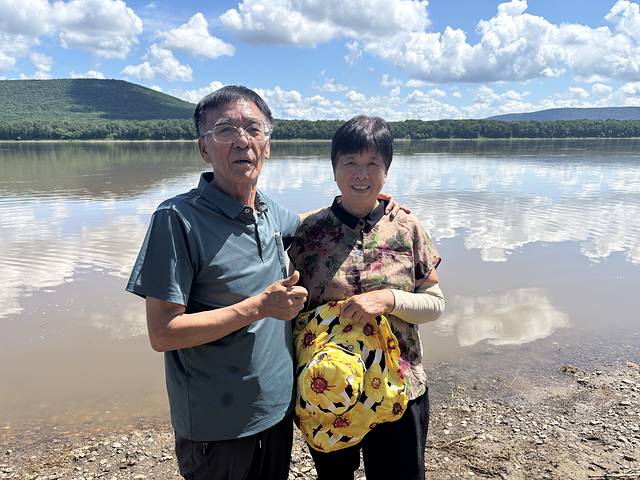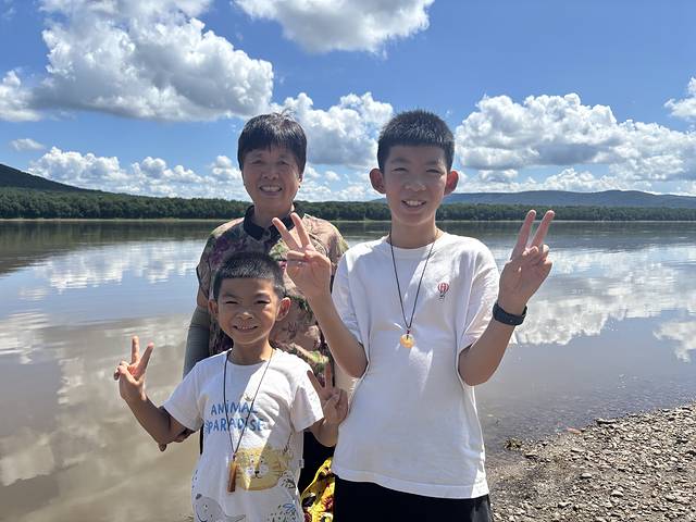 坐船游黑龙江,可以看到对岸边俄罗斯人在玩水