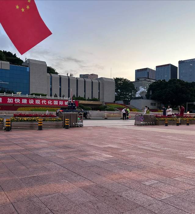 正午时分的广场在烈日下显得有些寂寥。我坐在树荫下的长椅上,观察广场的建筑细节。南侧的福建大剧院造型现代,玻璃幕墙反射着阳光;东侧的于山堂则保留着苏式建筑风格,红砖墙面上爬满了常春藤。这些不同年代的建筑围绕在广场周围,如同一个露天的建筑博物馆。广场地砖的拼花图案已经有些磨损,记录着无数脚步的痕迹。一位清洁工正在擦拭垃圾桶,他告诉我:"每天要清理上百个垃圾桶,节假日更多。"这些看不见的维护工作,让城市客厅始终保持整洁面貌。