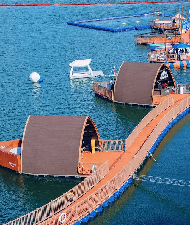 所谓"漂浮",原是指公园建在水上。整个园区由数十个白色浮箱拼接而成,走上去微微晃动,初时令人心惊,久了倒也习惯。浮箱之间的缝隙里,偶尔可见浑浊的江水涌动,泛着油光。岸边立着块牌子,上书"生态修复示范区",下面却飘着几个矿泉水瓶。