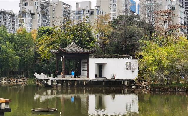 雨势渐小,公园里的人影也多了起来。湖心岛上,几位身着练功服的老者正在打太极,他们的白鹤亮翅与水中倒影相映成趣;回廊里,两个依姆用福州话拉着家常,软糯的方言与檐角滴落的水珠一样清脆悦耳;儿童游乐区传来阵阵欢笑,与树梢的鸟鸣交织成生动的晨曲。这座占地仅约3公顷的公园,竟像微缩的福州城,容纳着这座城市最本真的生活图景。