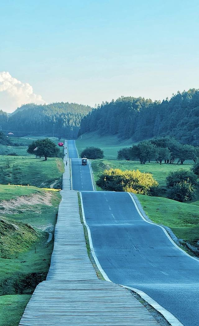 9. 抓马的结果是,我们先到大草原,结果人好多,我们没耍就说换乘小火车直接去最美公路,因为我们进景区比较晚,当时我们那趟车基本都是耍完要走的,跑马场站就没啥人下车,我们当时看美景也走神了,导致我们忘了下车,直接坐回了出口,哈哈哈,不甘心,准备重新买小火车票进景区,结果已经5点过了,小火车停运了,哈哈哈 我们就一不做二不休直接徒步往里走了,一路很舒服,还有小动物,小羊、牛、马都有,所以娃也不无聊,天气也好,走到大草原,我们就让爸爸们和娃在大草原玩,那个时候大草原人也少了。两个妈妈就继续徒步往最美公路走,一生为了出片的中国女人。。哈哈哈,没啥游客的草原真的是太美了,动物是散养的 不怕人也不攻击人 只要你不去惹,很美好。最后伴着夕阳、月辉慢慢一路走出景区8点过,一路还是有零零散散的游客徒步,也不止我们,所以也不害怕。但是累是真累 哈哈哈 如果你们想避开游客,可以像我们原计划,小火车坐进去,耍到晚一点走出来就还好。不然草原人多了真的就跟个公园一样,拍照也不好拍,不安逸。
