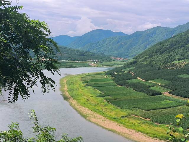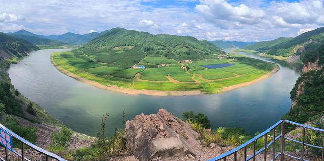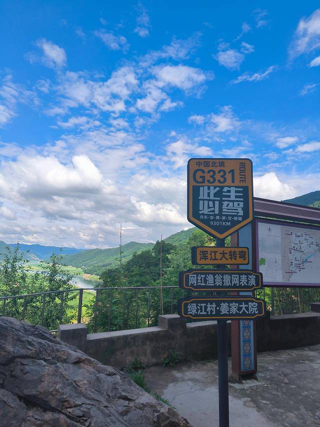 眼前的景象,瞬间将我所有的想象都比了下去。浑江在这里完成了一个近乎360度的大转弯,好似被一双无形的大手轻轻挽了个结。江水清澈碧绿,在阳光的照耀下波光粼粼,宛如流动的翡翠。环绕着大转弯的,是连绵起伏的青山,山上植被茂密,层层叠叠的绿意与湛蓝的天空相映成趣。