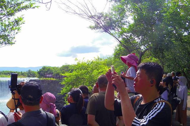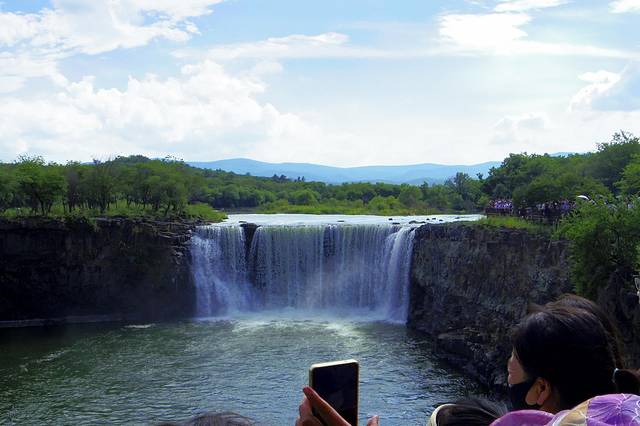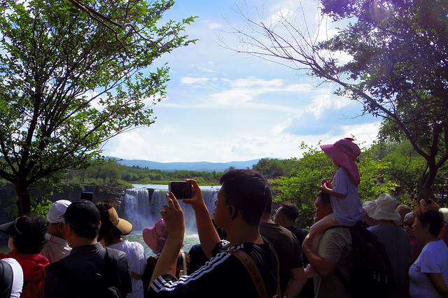 水流撞击着深潭,激起数十米高的白色水雾,在阳光下折射出若隐若现的彩虹,水雾裹挟着丝丝凉意扑面而来。沿着观景栈道前行,轰鸣愈发震耳欲聋。