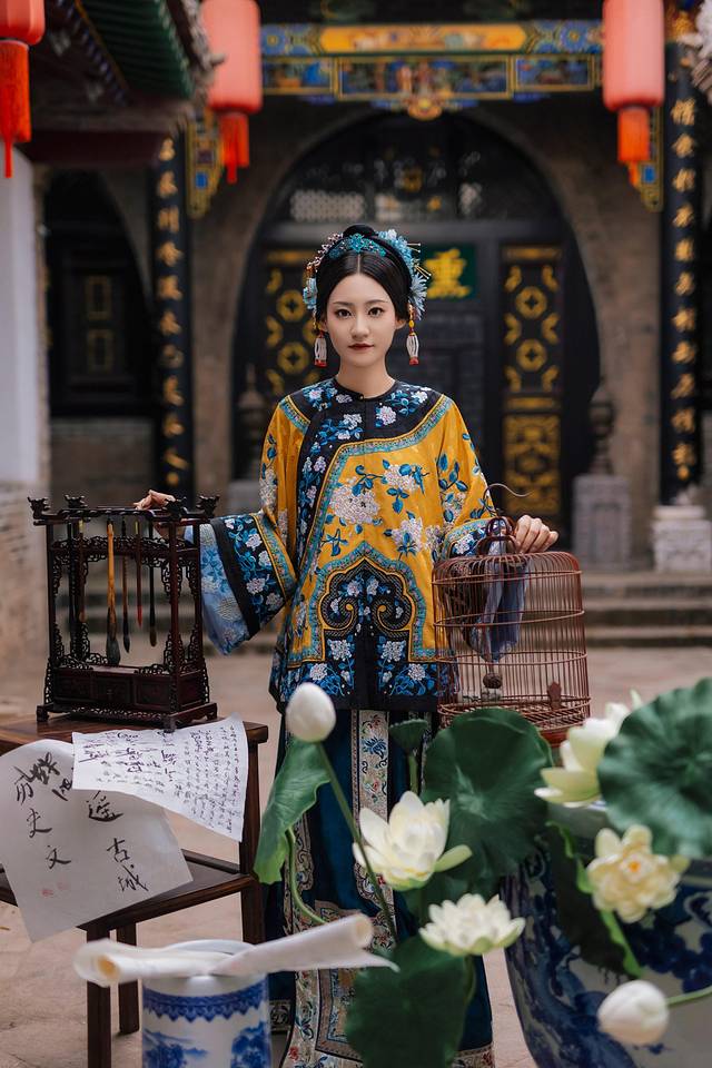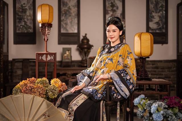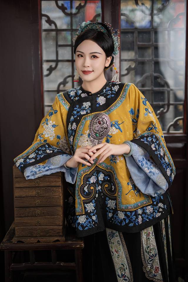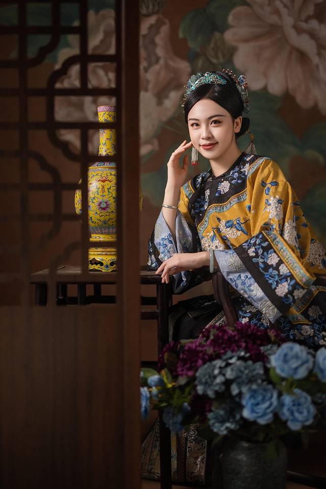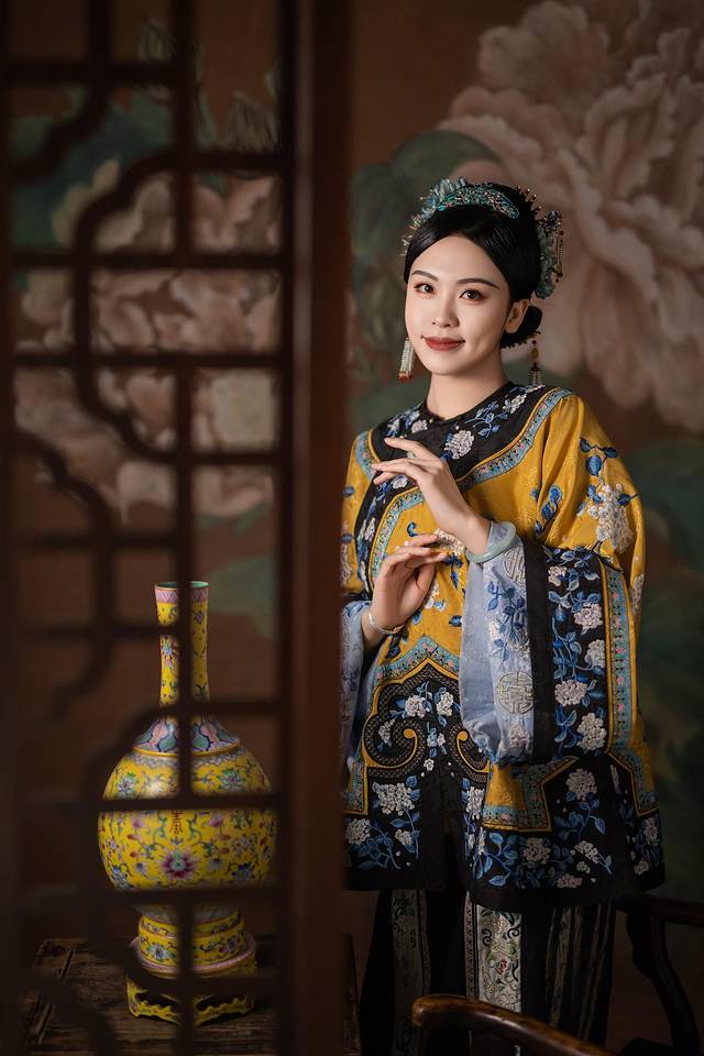 踏入摄影堂,仿佛一脚迈进了繁华的晋商时代。这里堪称全国独一无二的清代风情摄影圣地,琳琅满目的古董衣、点翠首饰瞬间吸引了我的目光。每件古董衣都珍稀高贵,仿佛诉说着过去的故事。点翠首饰更是珠光宝气,精致得让人移不开眼。我兴奋地挑选着,想象自己穿上后会是什么模样。