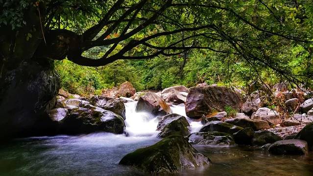 桃花源被人冠以“梵净第一水乡”“天然氧吧”的美称。这里常年四季恒温,均保持在15℃-24℃之间,雨水充沛,空气清新,万亩竹园、莽莽林海、成片花山。整个村由一条河和河谷、梵净山原始林带和无数的山溪飞瀑、沙洲及山寨风光组成。