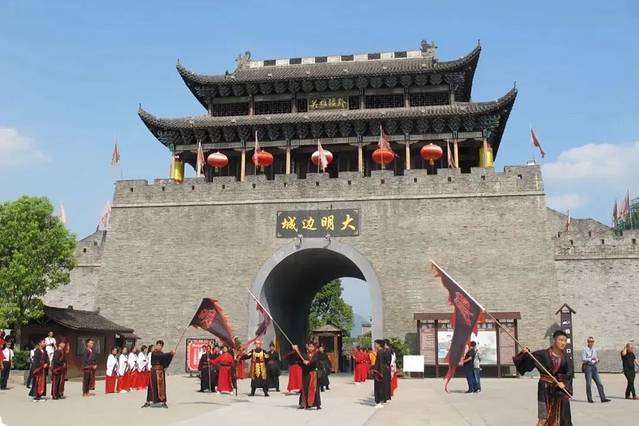 大明边城景区位于铜仁市东郊,景区以明“史”为据,以明“文化”为内涵,以明“军事”为主脉,以地方特色为背景,致力于对明朝以来贵州600年历史文化的挖掘,打造出了一座历史文化厚重、民族风情浓郁、景区内容丰富的综合主题文化景区。2012年,大明边城景区被评为国家4A级旅游景区。