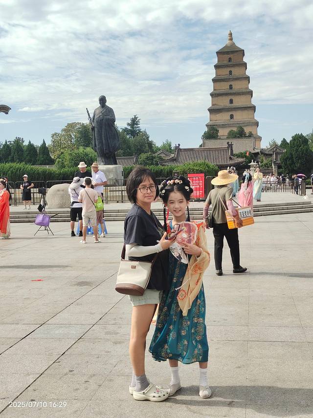 打车直奔大唐不夜城,这里科普一下,大唐芙蓉园,大唐不夜城,长安十二时辰,大雁塔,都在一块!大唐不夜城,免费,是指这一整个商业街区,大唐芙蓉园,是紧挨着的主题公园,需要单独门票,有演出和游船,需要完整的一天去游览;大雁塔,则是在紧挨着的大慈恩寺里,我们去时免票但需要预约,暑期么当天的票早没了,所以就在广场上合了个影。时间关系,走马观花!