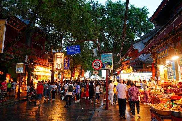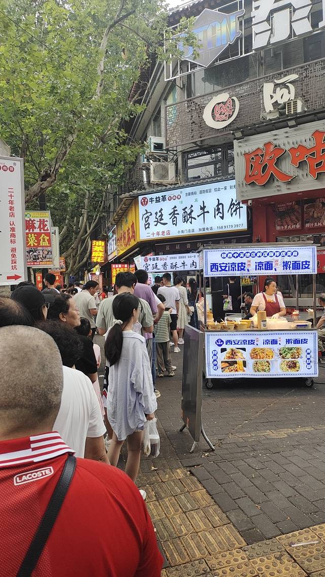 人很多,很热闹!暑期么,全是天南海北的游客,尝了下各式小吃,凉皮一般,肘子肉夹馍还行,这个牛肉饼很香,不白排队!茉莉豆浆很香,两位女士一致好评!酸梅汤也不错!剩下的什么胡辣汤啊醪糟啊的都不很合口味。物价还是挺高,上面提到的一律10块起步,吃完回酒店睡觉!