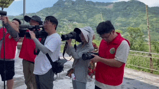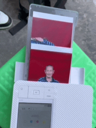 有一群人抱着相机、相纸、打印机