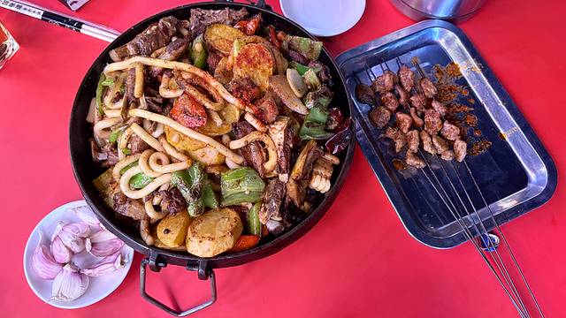 醒醒到站该吃饭啦,超大羊肉串也是吃到了