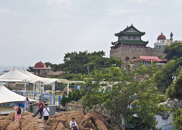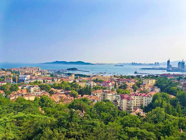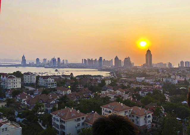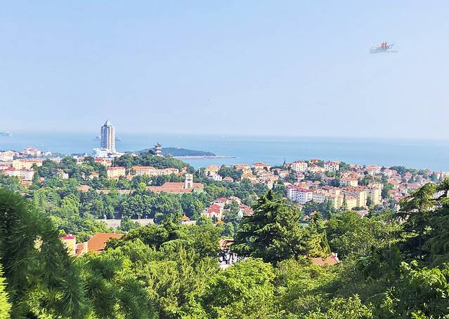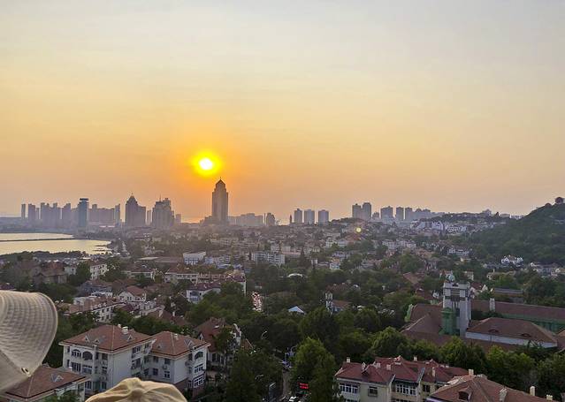 回来又休息到4:30,这就是距离景点近的好处呀。打车去小鱼山,真是2分钟就上来了,又爬到亭子上,但天空还是雾雾的,落日也就没什么可看的了,转了一圈下山准备去海信广场天台。