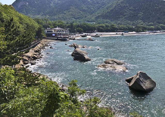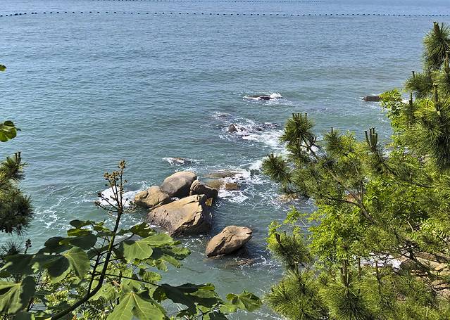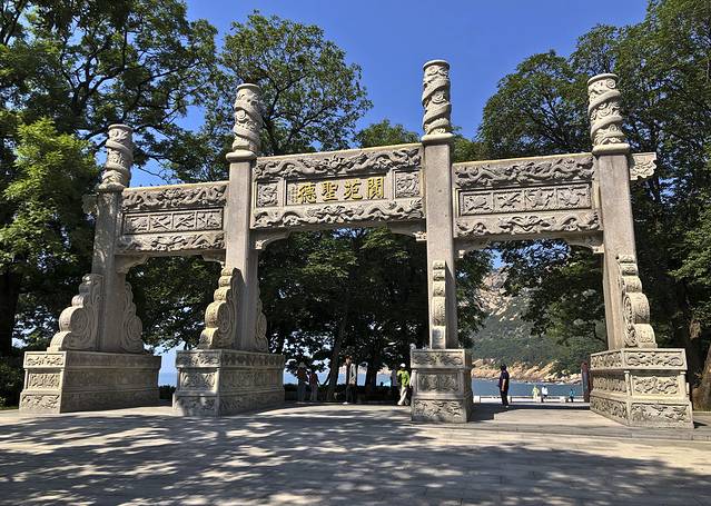 今天继续游览崂山,7:00多点出门,4号线到大河东游客中心,观光车到太清宫。太清牌坊离海边很近,先过去海边看看,清晨阳光下海水清澈湛蓝。