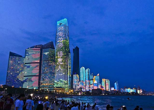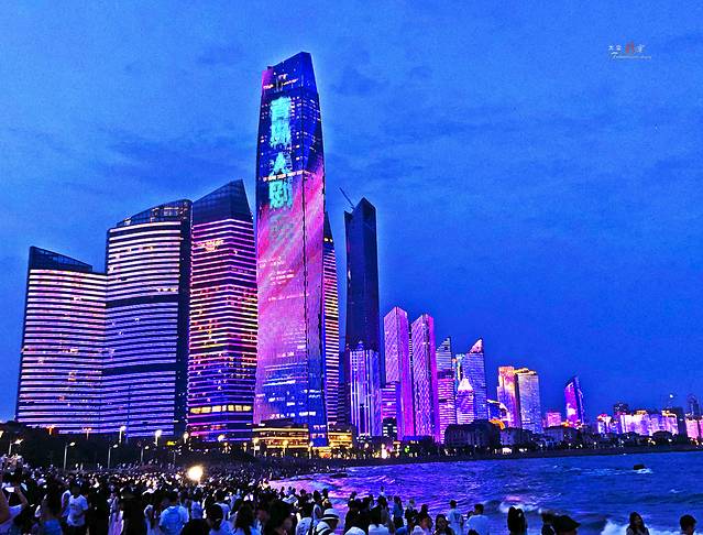 5:00闭馆,下班时间很堵车,接受昨天的教训,今天决定不回酒店了,休息会儿直接去第三海水浴场拍摄灯光秀,没拍到蓝调画面就是不甘心。 在海洋世界院子里找了一个地方休息吃东西,快6:00出发去第三海水浴场,距离不远6:30就到了,没有坐的地方,大家都坐在沙滩上,我也找了个地方坐下。7:00就有的大楼开始亮灯了。7:20进入最美时段,蓝调天幕下高低错落的大楼,变幻着各种艳丽色彩与图案,美仑美奂极为靓眼。