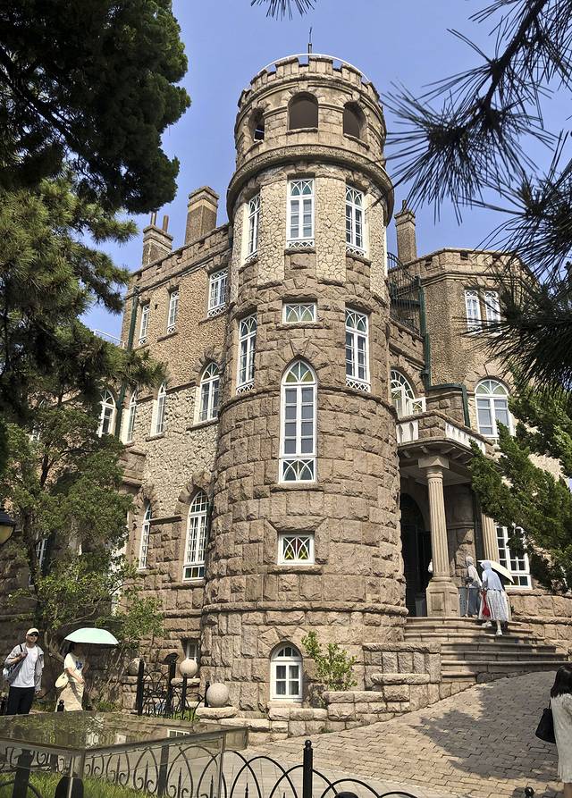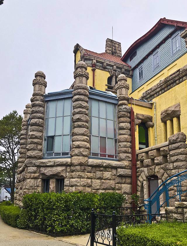 首先参观了花石楼,哥特式建筑,建于1930年,外墙由花岗岩石砌筑,塔楼顶部为雉堞式女儿墙。是一幢融合了西方多种建筑艺术风格的欧洲古堡式建筑,既有希腊和罗马式风格,又有哥特式建筑特色。这是八大关最漂亮的建筑,从外观到内部都非常别致。