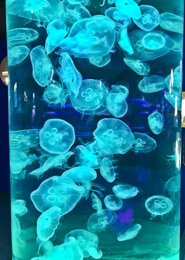休息到3:00打车去游览海洋世界。一片礁石海滩边竖着一栋中式殿宇建筑,不进馆在这片海滩上休闲也不错。一个个馆游览完感觉青岛海洋世界没有太靓眼的内容,也许极地海洋世界更好些。