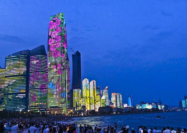 观察了这里的情况,感觉观赏灯光秀最佳地点就是第三海水浴场,但要往南走,浴场最南端的位置、角度、距离最佳,不向南走位置比较斜。海信广场天台和帆船中心距离太远了,并没有这里好。